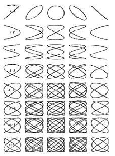 Jules Antoine Lissajous (1822-1880) - Jules Lissajous, a French physicist and mathematician, investigated the relationships of sound frequencies, waves, and vibrations. In 1850, his doctoral thesis was based on vibrating bars using Chladni's sand patterns and nodal theories. Lissajous began his experiments with sound waves and vibrations by using tuning forks in water and noting the ripple patterns from different applied frequencies.